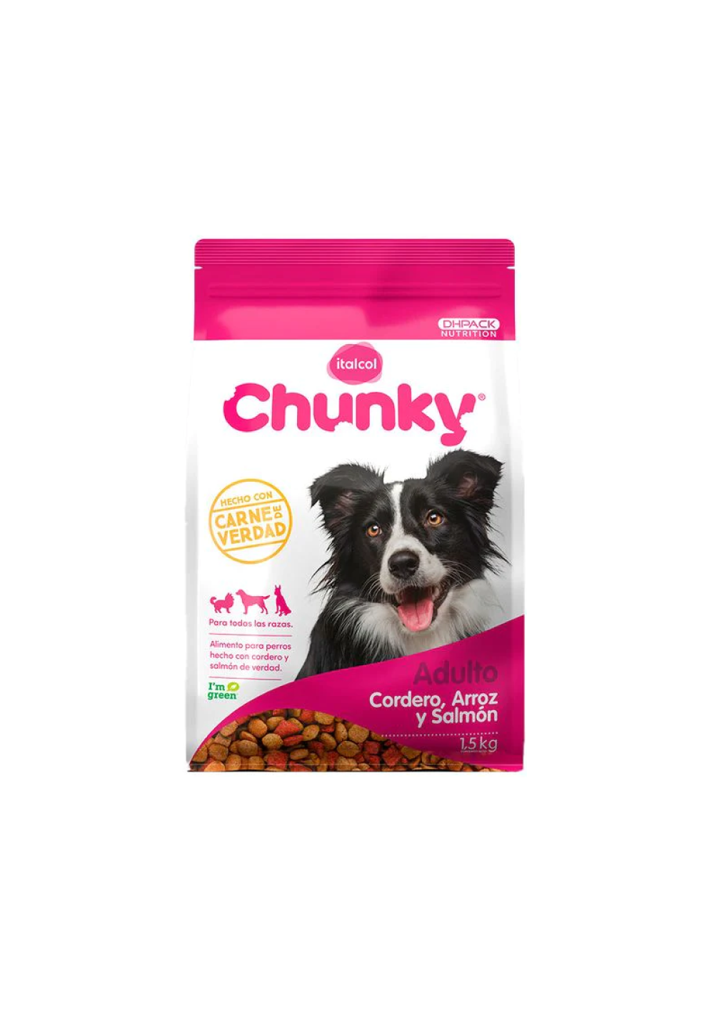 Chunky Adulto Cordero, Arroz y Salmón es un alimento concentrado de alta calidad para perros adultos de todas las razas. Ideal para perros con estómagos y pieles sensibles. Con ingredientes hipoalergénicos como cordero y salmón, minimiza las reacciones alérgicas comunes en otros concentrados.